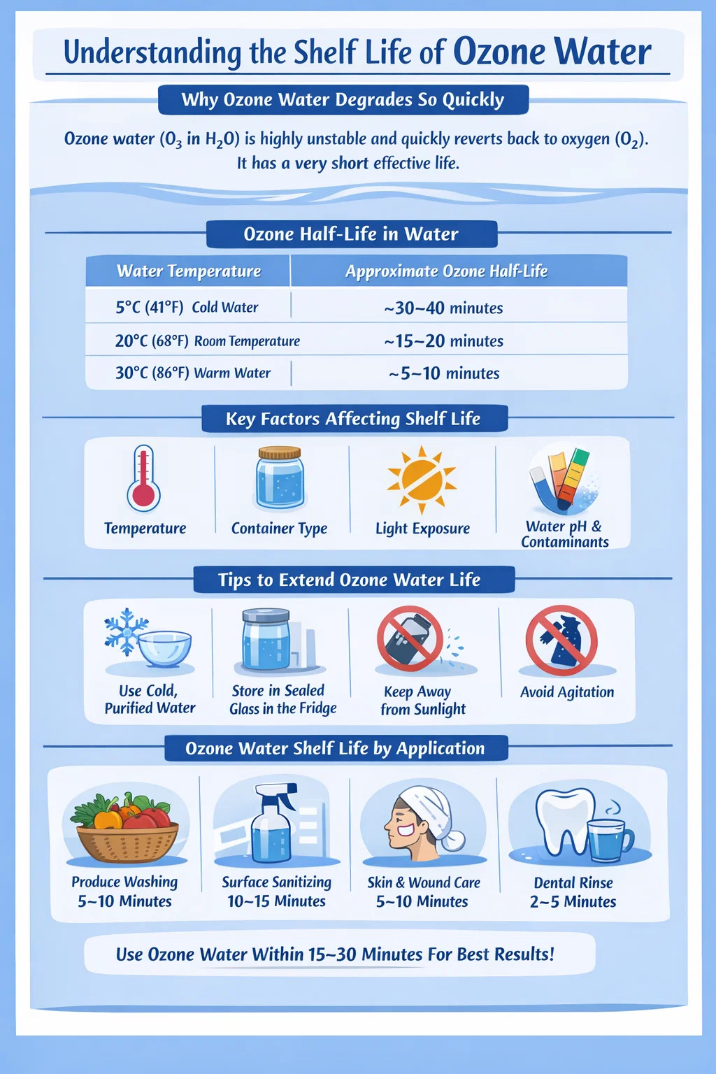 Sesetengah bahan pemasaran untuk penjana ozon pengguna mencadangkan produk mereka mencipta air ozon yang kekal berkesan selama "beberapa jam." Ini tidak tepat dalam keadaan biasa. Pada suhu bilik dalam bekas biasa yang tidak bertutup, air ozon kehilangan sebahagian besar ozon aktifnya dalam masa 15 hingga 30 minit. Satu-satunya senario di mana air ozon mungkin mengekalkan kepekatan bermakna melebihi satu jam adalah dalam bekas kaca tertutup yang disimpan pada suhu hampir beku dengan dos ozon awal yang sangat tinggi — keadaan yang tidak biasa dalam persekitaran rumah.
