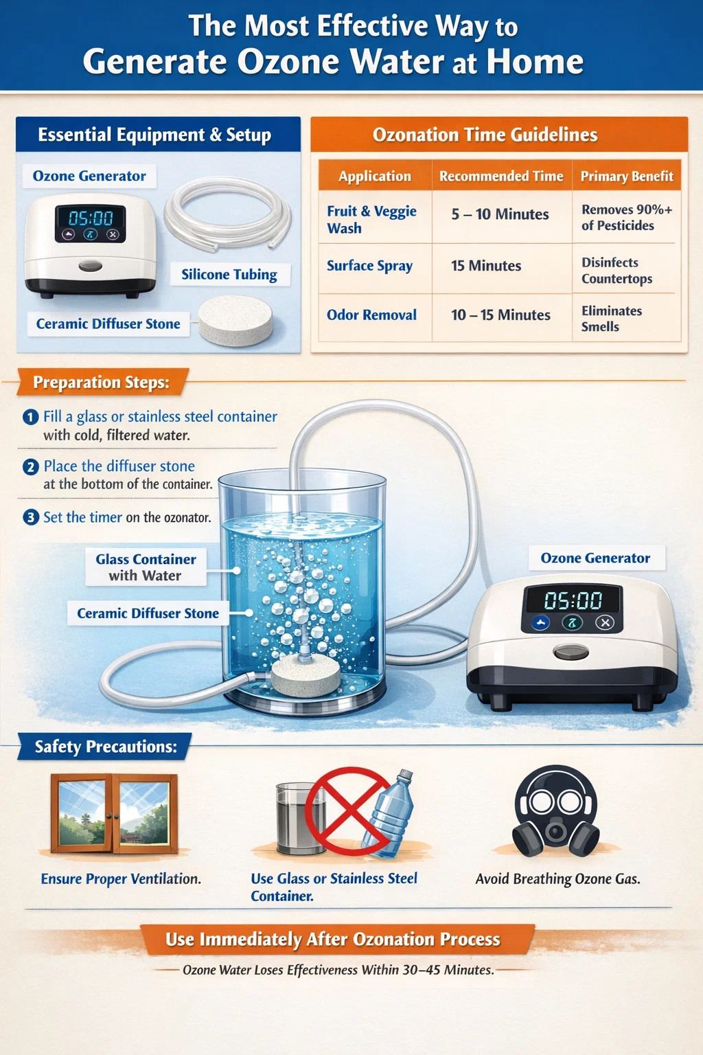 Air ozon adalah sangat tidak stabil dan mencapai kuasa sanitasi kemuncaknya sejurus selepas pengeluaran. Untuk tugasan rumah seperti membasuh sayur atau kaunter sanitasi, kitaran menggelegak selama 5 hingga 10 minit dalam satu liter air biasanya mencukupi untuk mencapai pembasmi kuman kesan yang mengatasi banyak pembersih kimia.