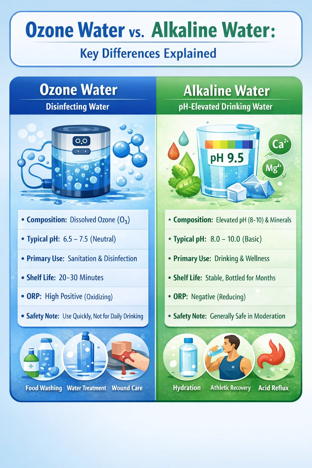 Air ozon dan air beralkali adalah produk yang berbeza dengan kimia yang berbeza, aplikasi yang berbeza, dan asas bukti yang berbeza. Air ozon ialah pembasmi kuman yang berkuasa dan tahan lama yang terbaik digunakan untuk tugas sanitasi — mencuci makanan, merawat permukaan dan pembersihan air. Air alkali ialah produk air minuman yang mempunyai pH yang tinggi dengan faedah sederhana dan masih diperdebatkan berkaitan dengan pengurusan penghidratan dan refluks asid.