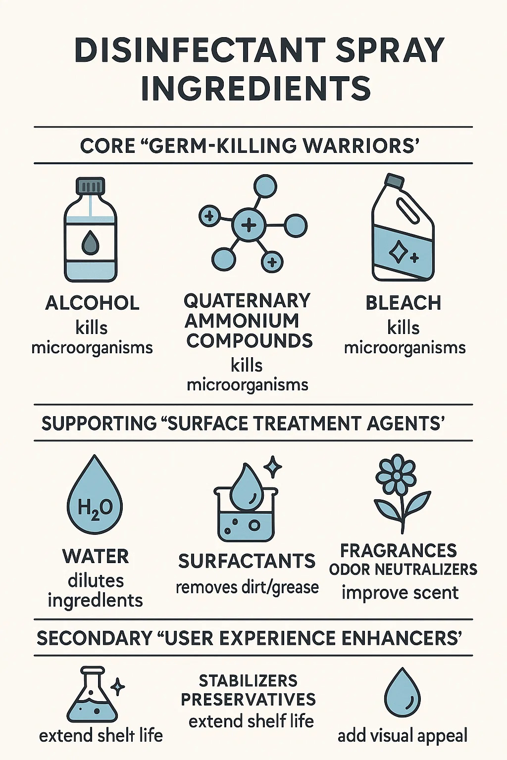 Untuk mewujudkan yang berkesan semburan disinfektan , bahan -bahan "wira" utama boleh dikategorikan secara meluas seperti berikut: